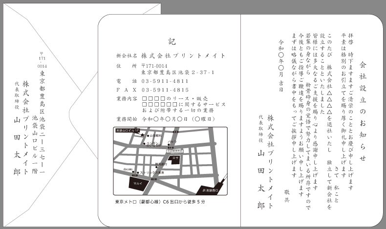 別記にて新会社の詳細をお知らせする標準的な内容です