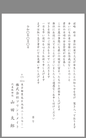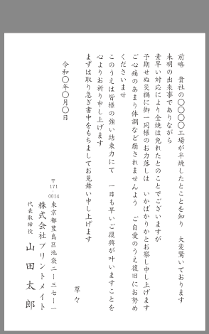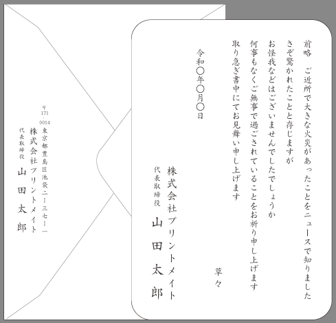 火災など災害のお見舞い状印刷は例文を選ぶ、自分で考えた挨拶文、データ入稿にて注文可能