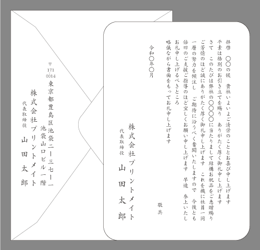 ビジネスでのお礼状は、「封筒付き挨拶状」で印刷するのががおすすめですが、頂いたものに応じて使い分けてください。