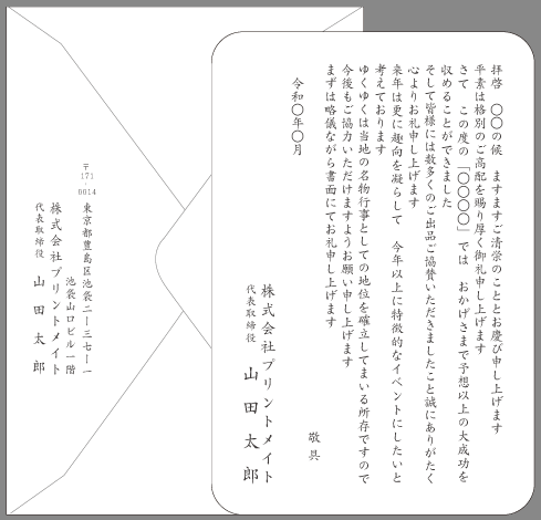 ビジネスでのお礼状は、「封筒付き挨拶状」で印刷するのががおすすめです。