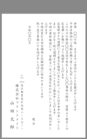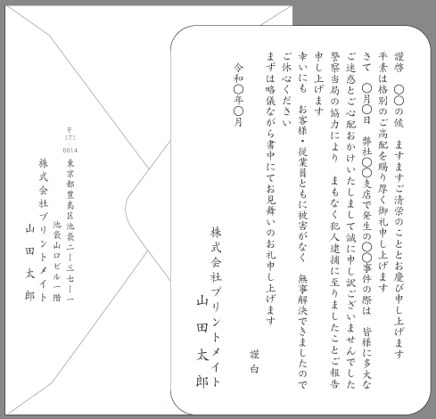会社での事件発生時に頂いたご厚情やお見舞いへのお礼状例文です。