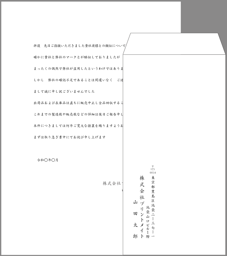 侵害のお詫び状は、「封筒付き挨拶状」で印刷することができます。改まった書状を送るときは形式を重んじて封筒付きタイプがよいと思います。
