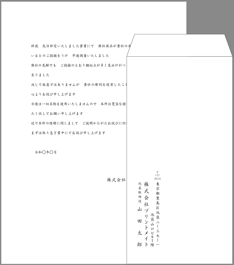 侵害のお詫び状印刷は例文を選ぶ、自分で考えた挨拶文、データ入稿にて注文可能