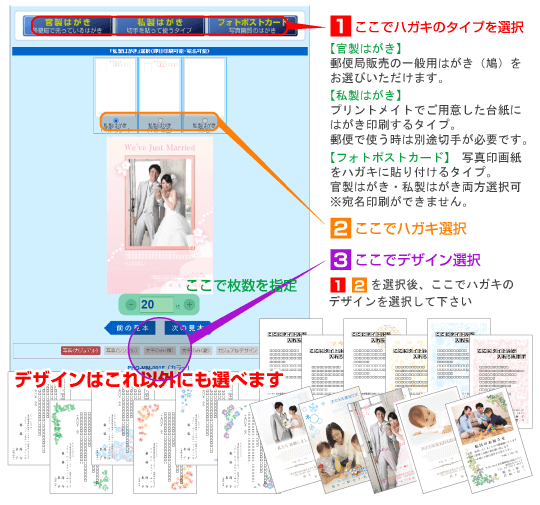 注文内容を入力する前に、先ず「はがきタイプ・種類」「デザイン」を選択して頂きます。![]() |